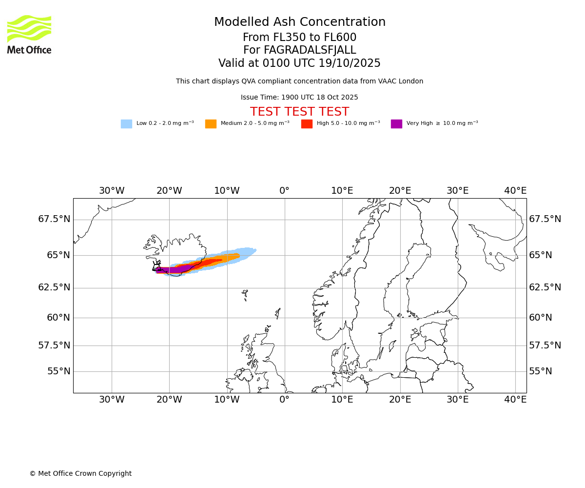 Modelled ash concentration from 350 to 600 for FAGRADALSFJALL. Valid at 1900 UTC 18/10/2025