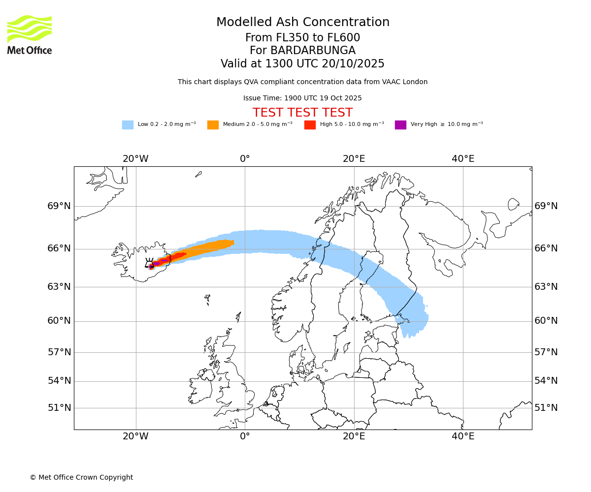 Modelled ash concentration from 350 to 600 for BARDARBUNGA. Valid at 0700 UTC 20/10/2025