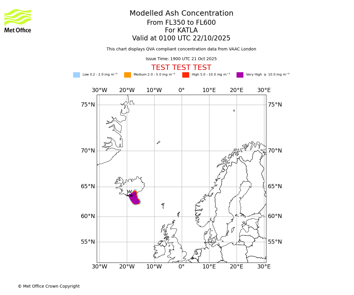 Modelled ash concentration from 350 to 600 for KATLA. Valid at 1900 UTC 21/10/2025