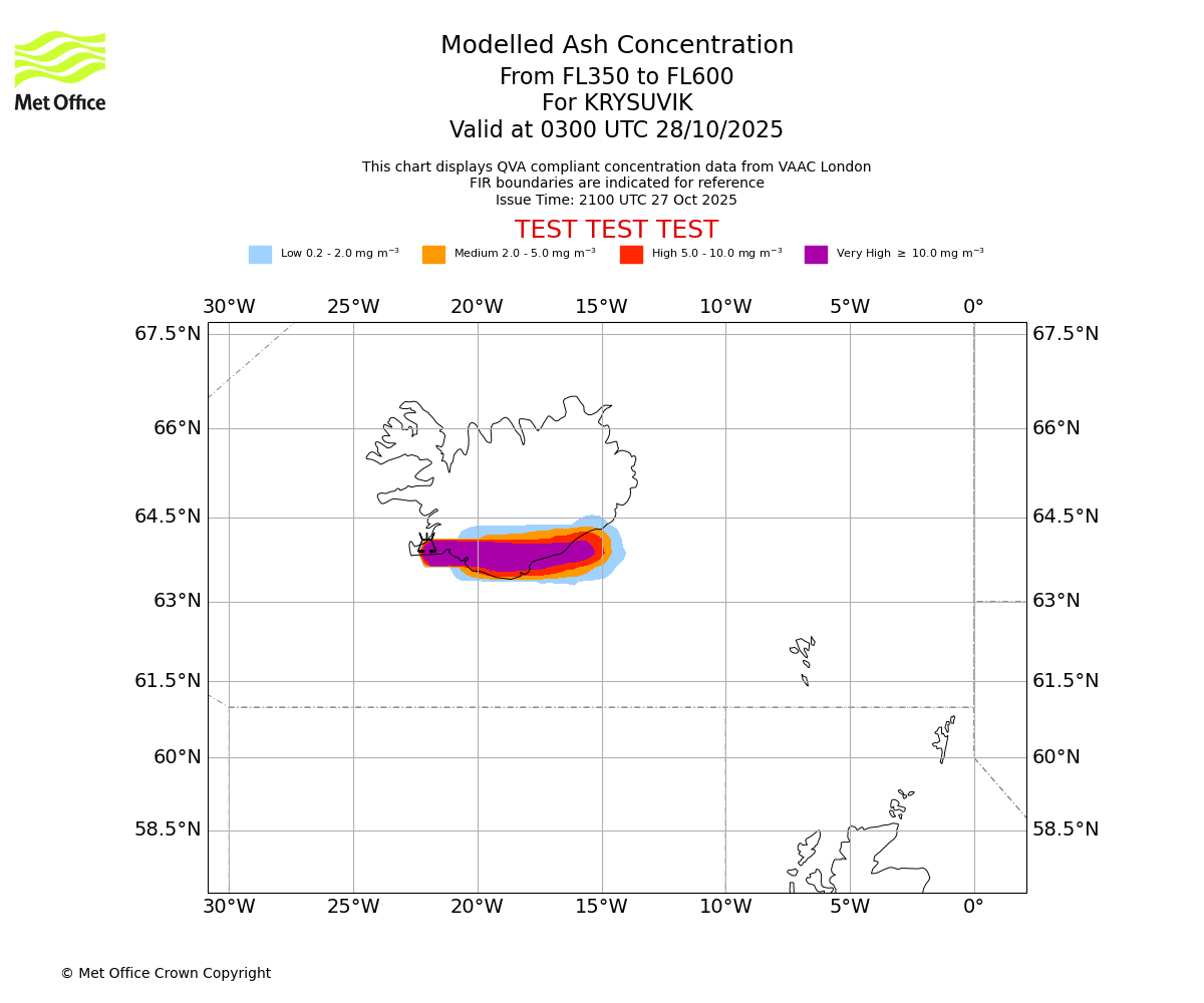 Modelled ash concentration from 350 to 600 for KRYSUVIK. Valid at 2100 UTC 27/10/2025