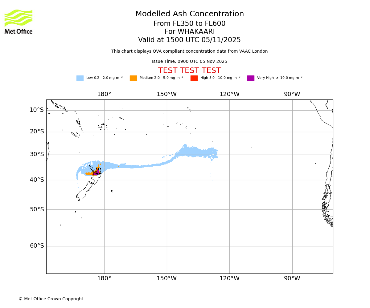 Modelled ash concentration from 350 to 600 for WHAKAARI. Valid at 0900 UTC 05/11/2025