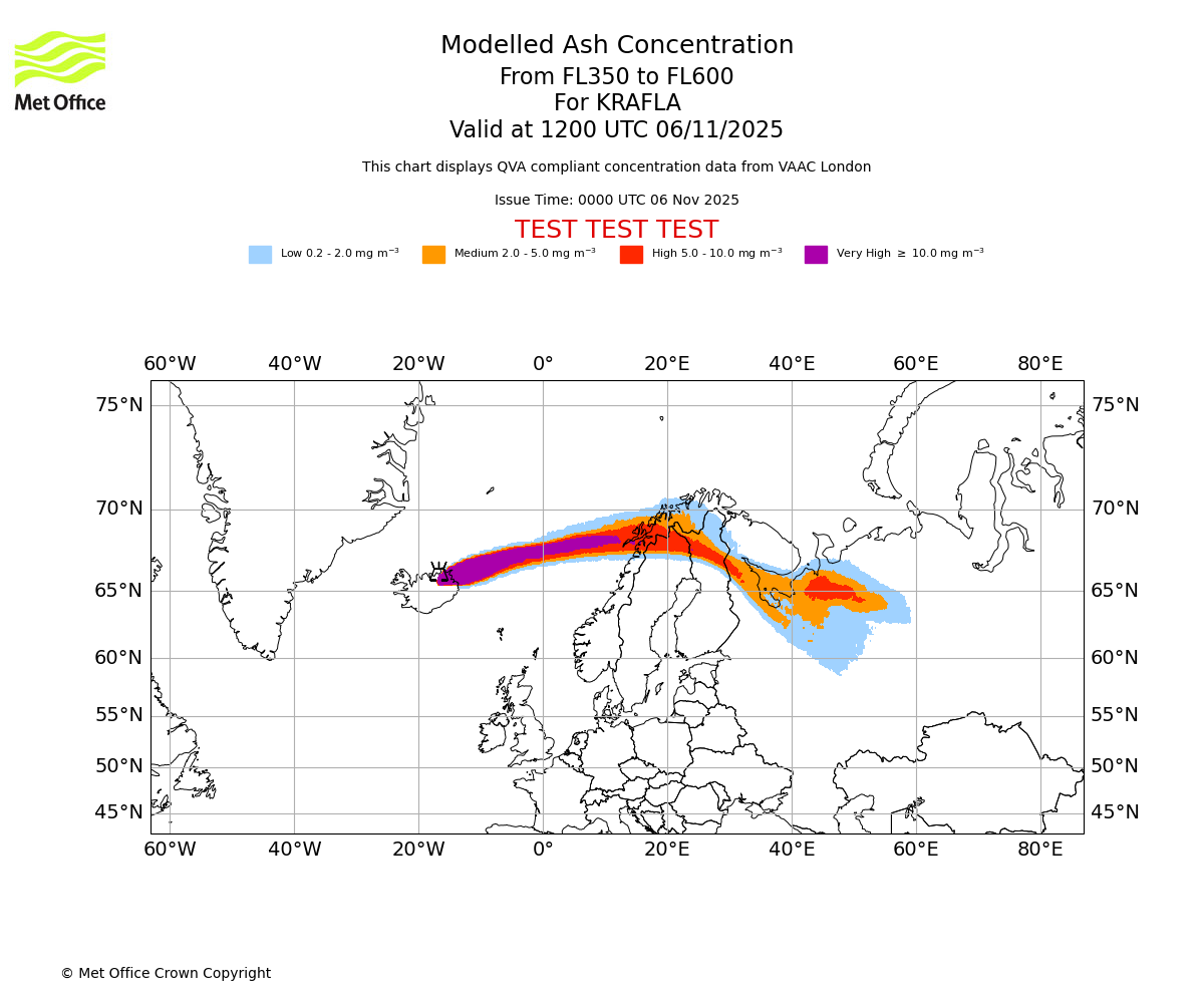 In accordance with ICAO Annex 3, Amendment 82 VAAC London will provide operational QVA forecasts from 27 November 2025 and these will be made available via a VAAC London QVA API information service. These charts are currently provided for test and evaluation purposes (not for operational use) until the introduction of the operational service.