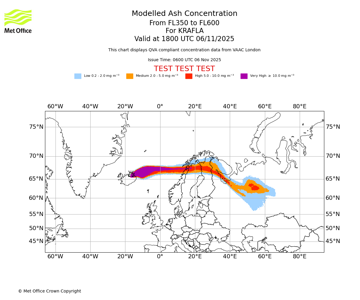 In accordance with ICAO Annex 3, Amendment 82 VAAC London will provide operational QVA forecasts from 27 November 2025 and these will be made available via a VAAC London QVA API information service. These charts are currently provided for test and evaluation purposes (not for operational use) until the introduction of the operational service.
