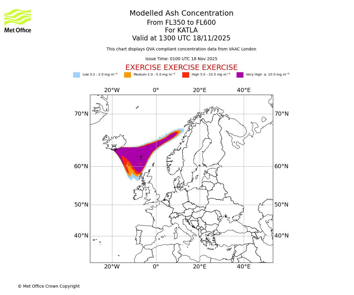 Modelled ash concentration from 350 to 600 for KATLA. Valid at 0700 UTC 18/11/2025