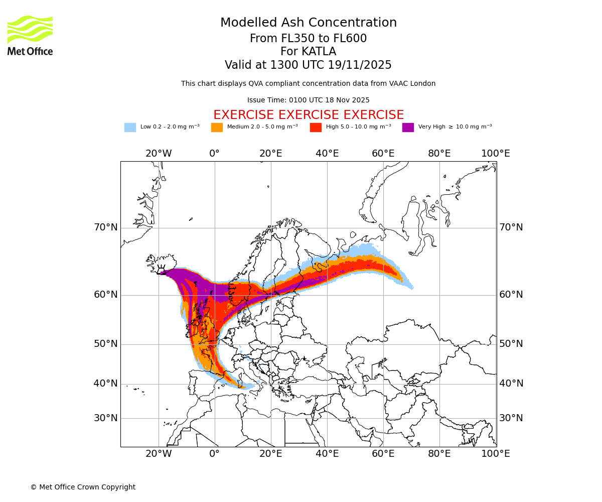Modelled ash concentration from 350 to 600 for KATLA. Valid at 0700 UTC 19/11/2025
