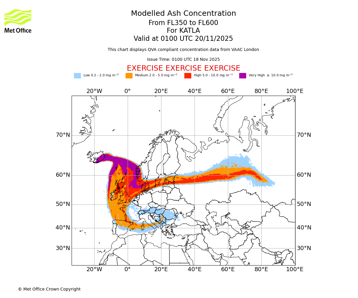 Modelled ash concentration from 350 to 600 for KATLA. Valid at 1900 UTC 19/11/2025