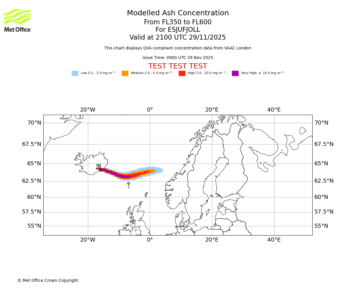 Modelled ash concentration from 350 to 600 for ESJUFJOLL. Valid at 1500 UTC 29/11/2025