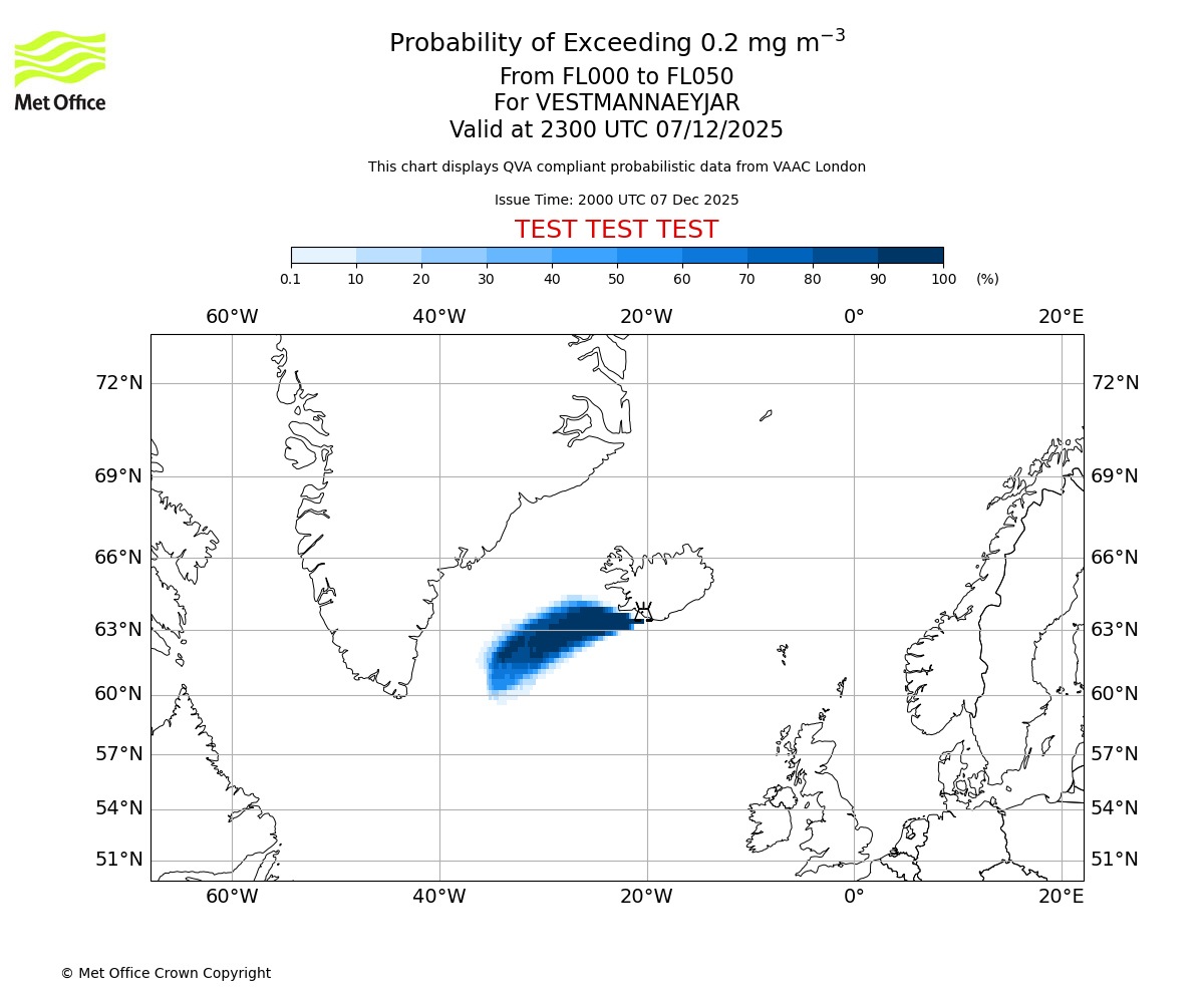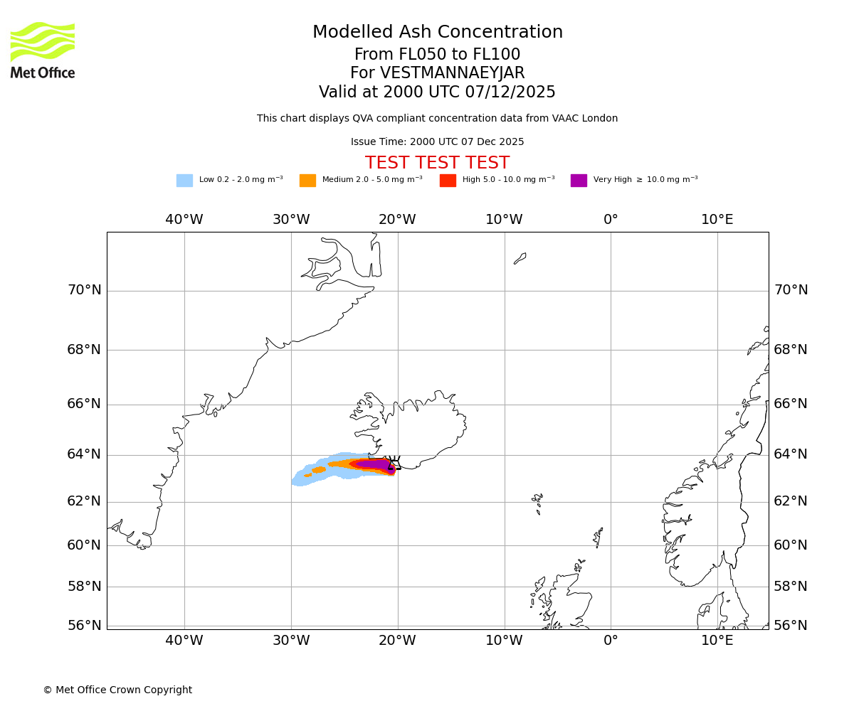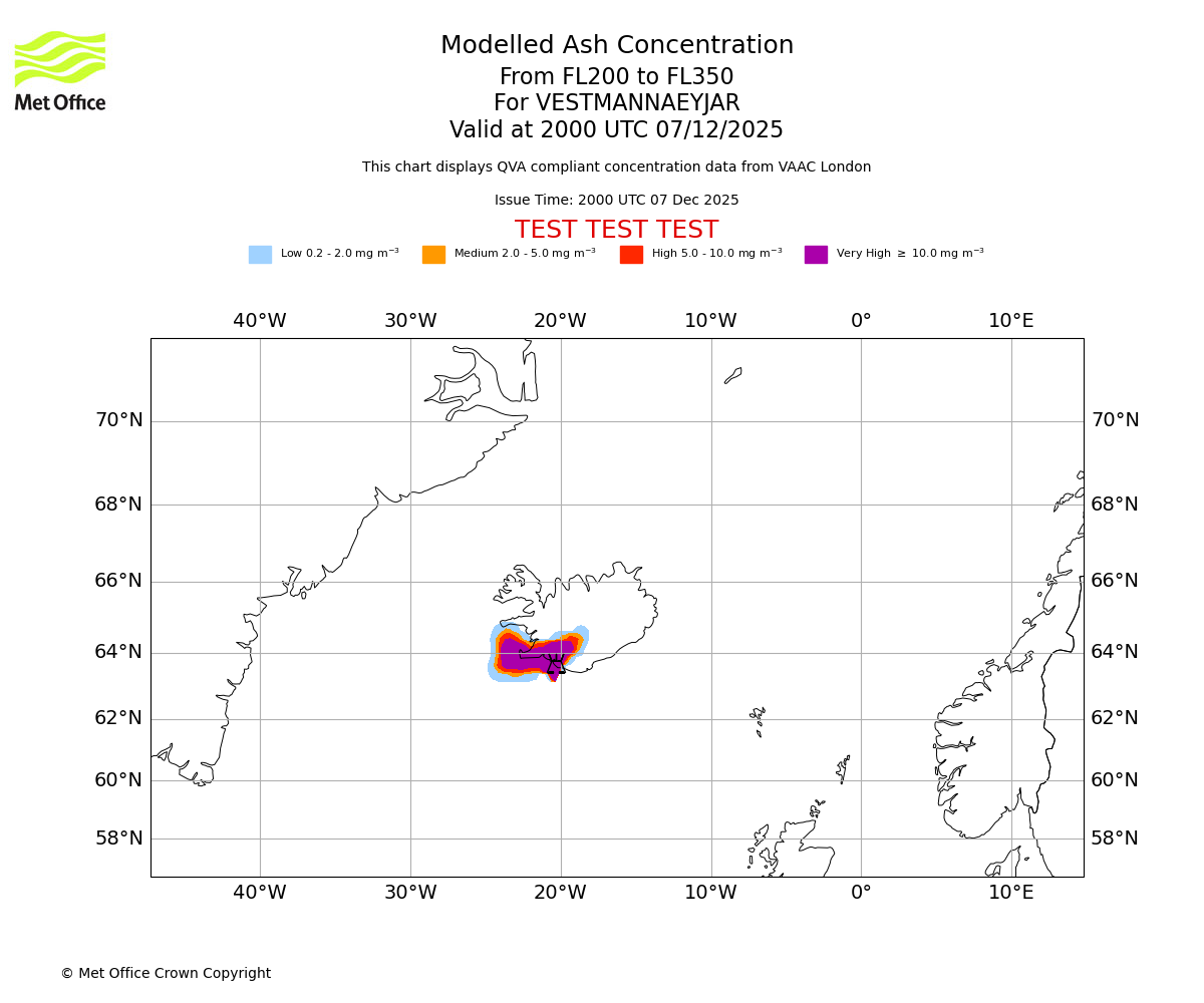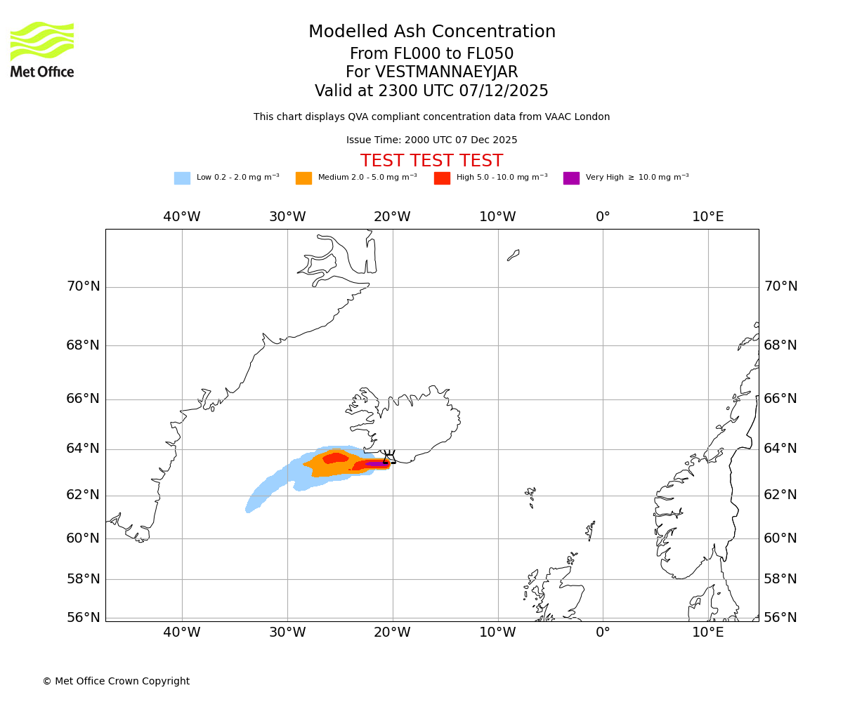 Modelled ash concentration from 000 to 050 for VESTMANNAEYJAR. Valid at 2000 UTC 07/12/2025