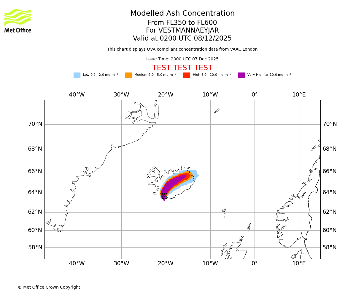 Modelled ash concentration from 350 to 600 for VESTMANNAEYJAR. Valid at 2000 UTC 07/12/2025