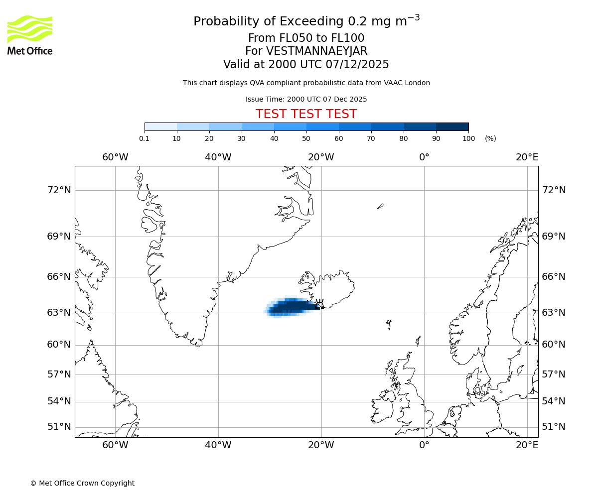 Probability of exceeding 0.2 milligrams per metre cubed. From 000 to 050 for VESTMANNAEYJAR. Valid at 2000 UTC 07/12/2025