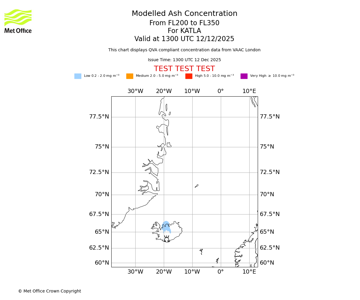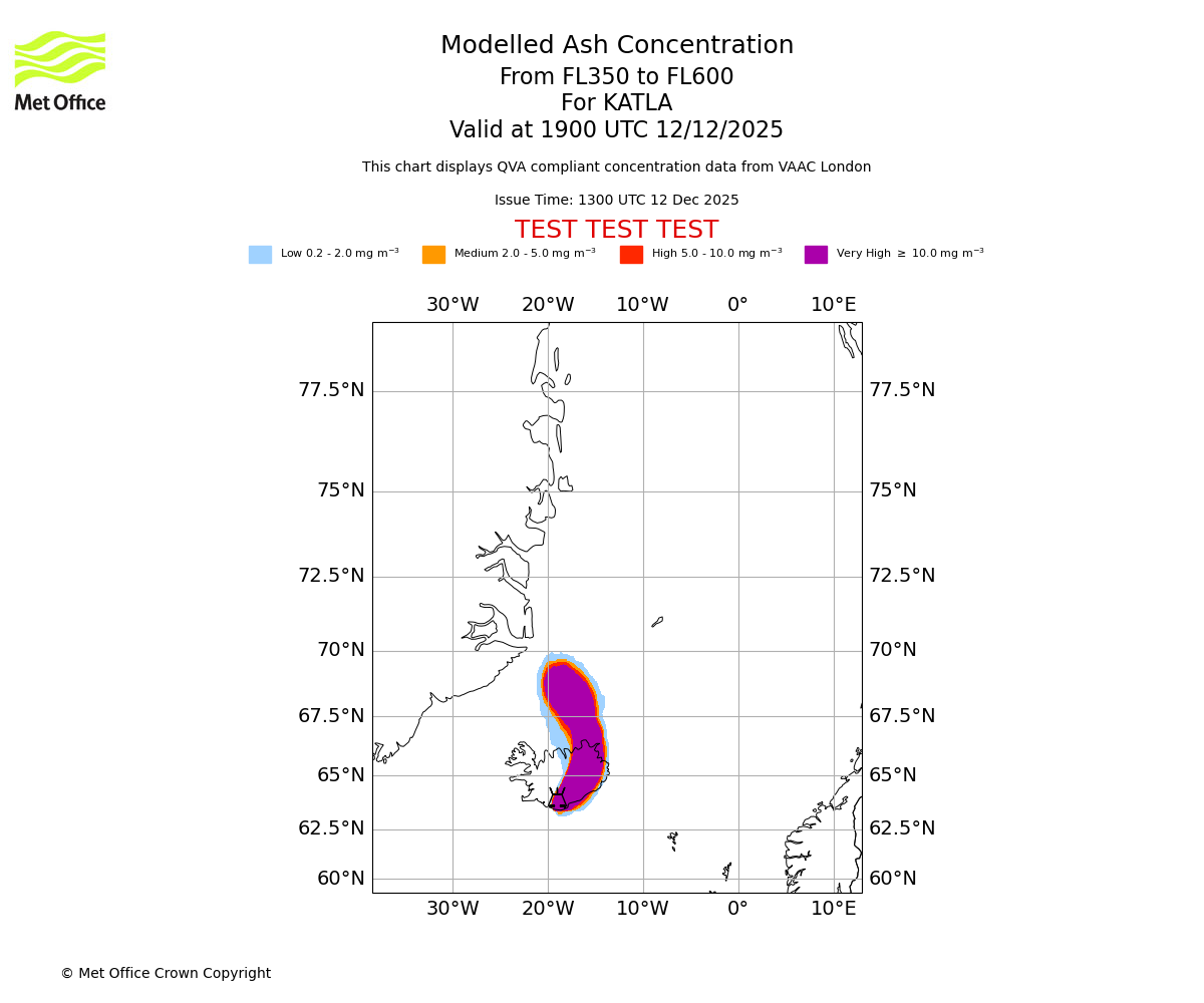 Modelled ash concentration from 350 to 600 for KATLA. Valid at 1300 UTC 12/12/2025