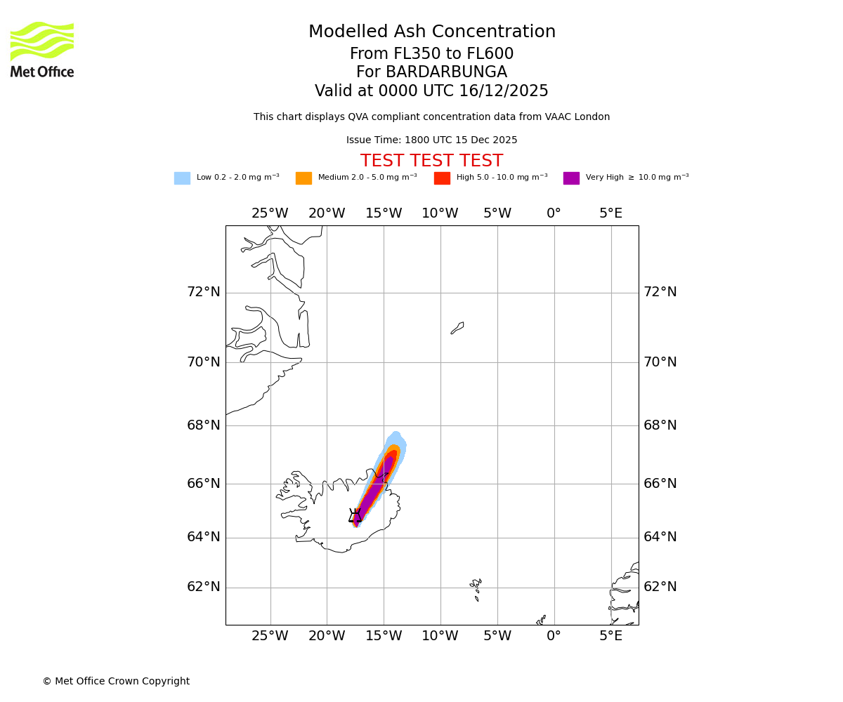 Modelled ash concentration from 350 to 600 for BARDARBUNGA. Valid at 1800 UTC 15/12/2025
