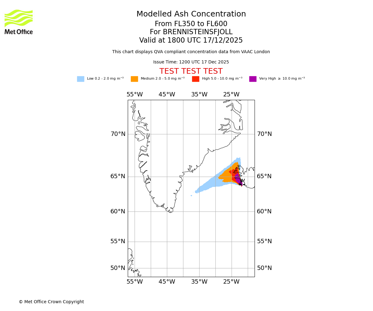 Modelled ash concentration from 350 to 600 for BRENNISTEINSFJOLL. Valid at 1200 UTC 17/12/2025