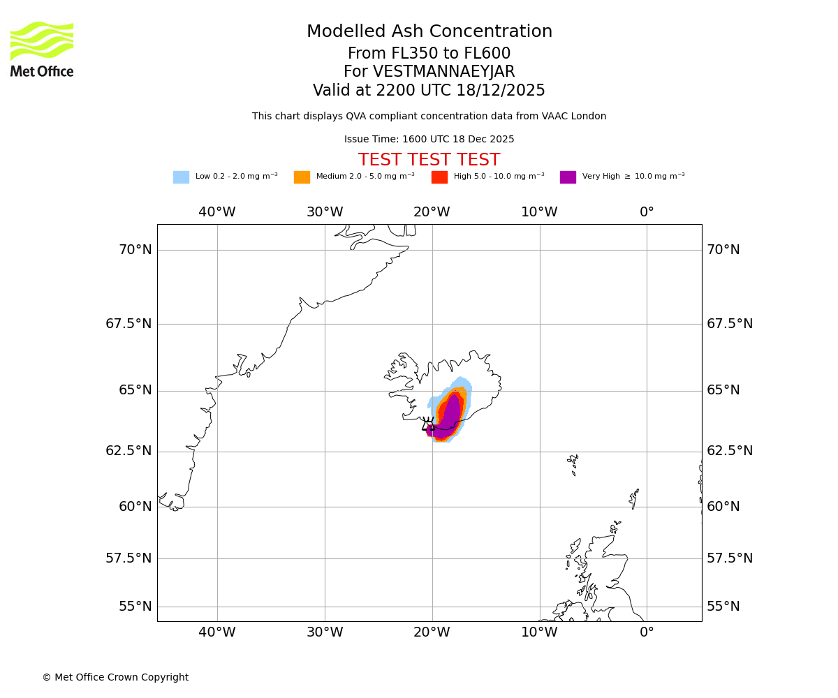Modelled ash concentration from 350 to 600 for VESTMANNAEYJAR. Valid at 1600 UTC 18/12/2025