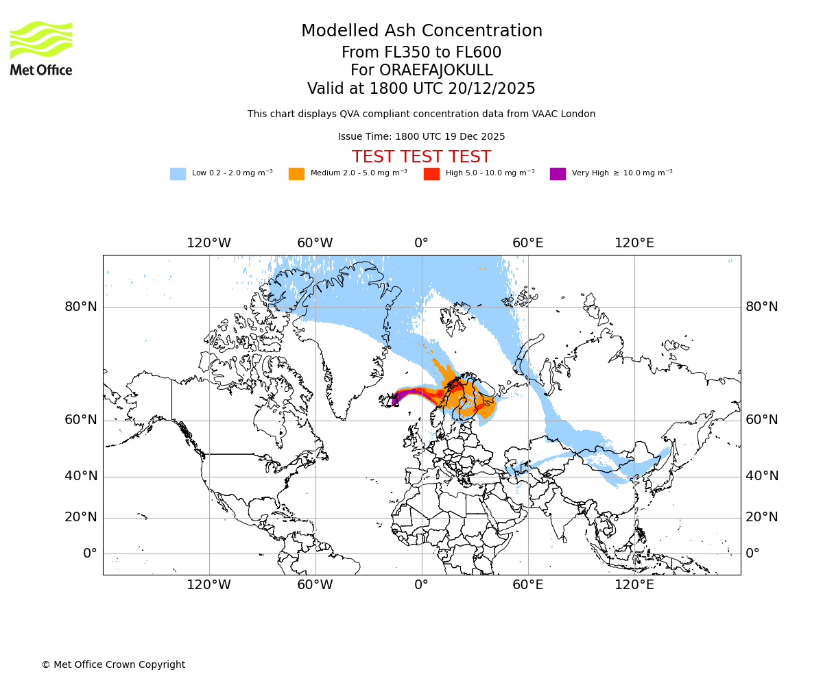 Modelled ash concentration from 350 to 600 for ORAEFAJOKULL. Valid at 1200 UTC 20/12/2025