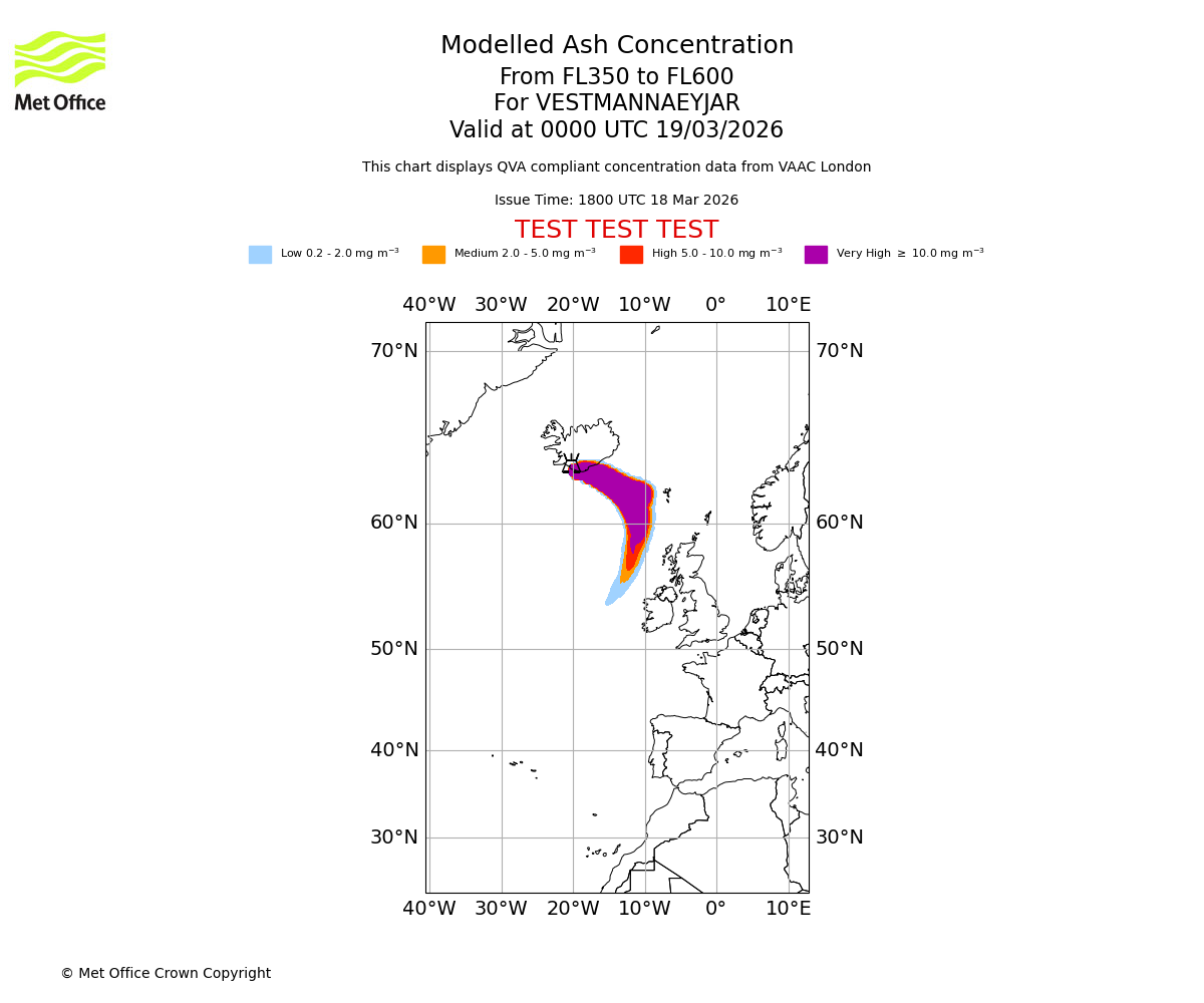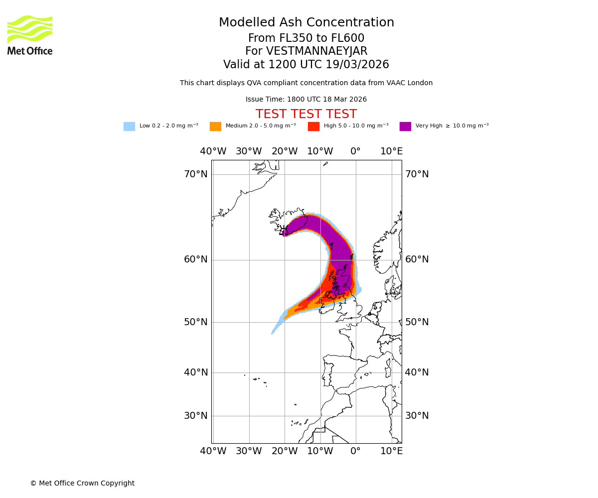 Modelled ash concentration from 350 to 600 for VESTMANNAEYJAR. Valid at 0600 UTC 19/03/2026