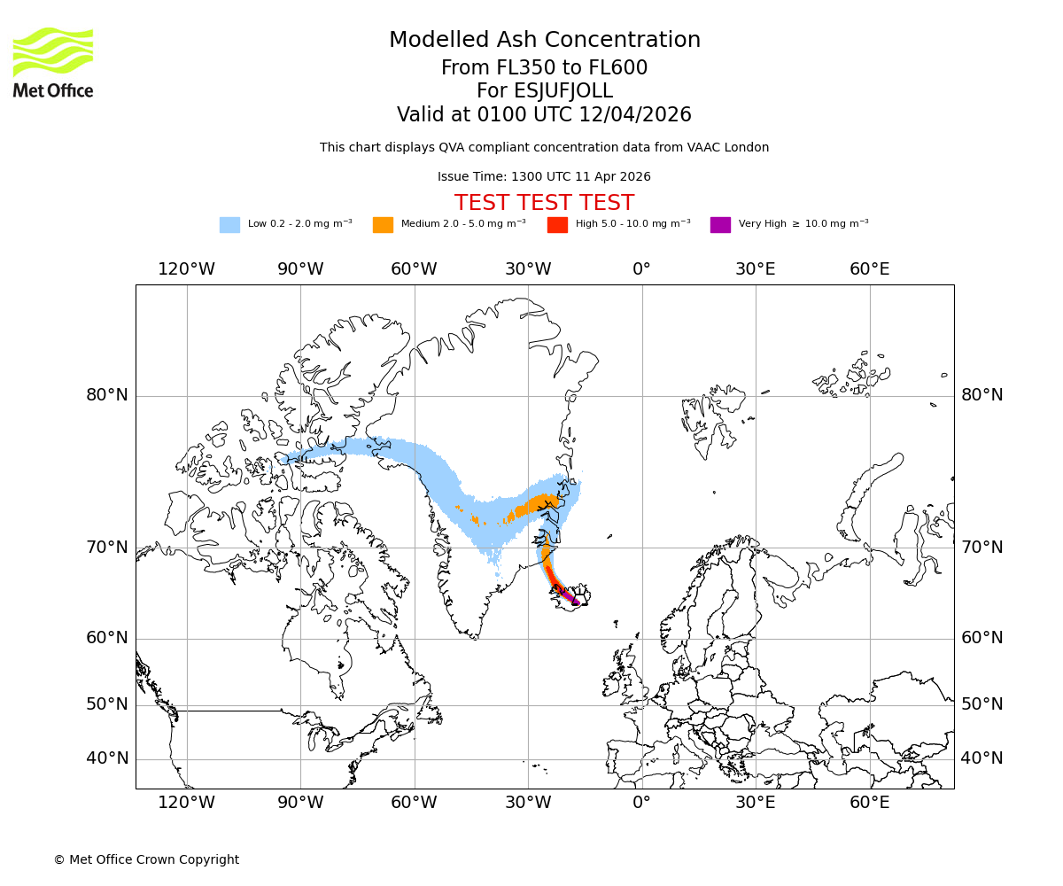 Modelled ash concentration from 350 to 600 for ESJUFJOLL. Valid at 1900 UTC 11/04/2026