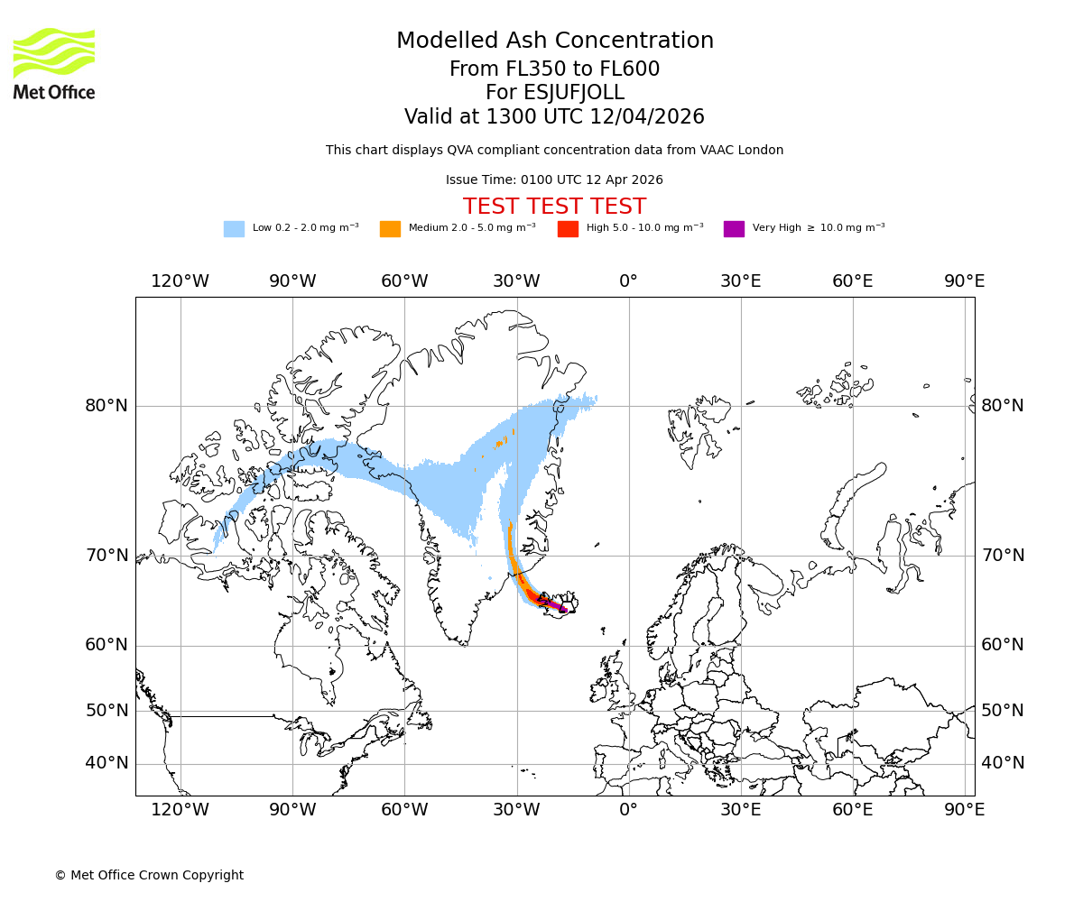 Modelled ash concentration from 350 to 600 for ESJUFJOLL. Valid at 0700 UTC 12/04/2026