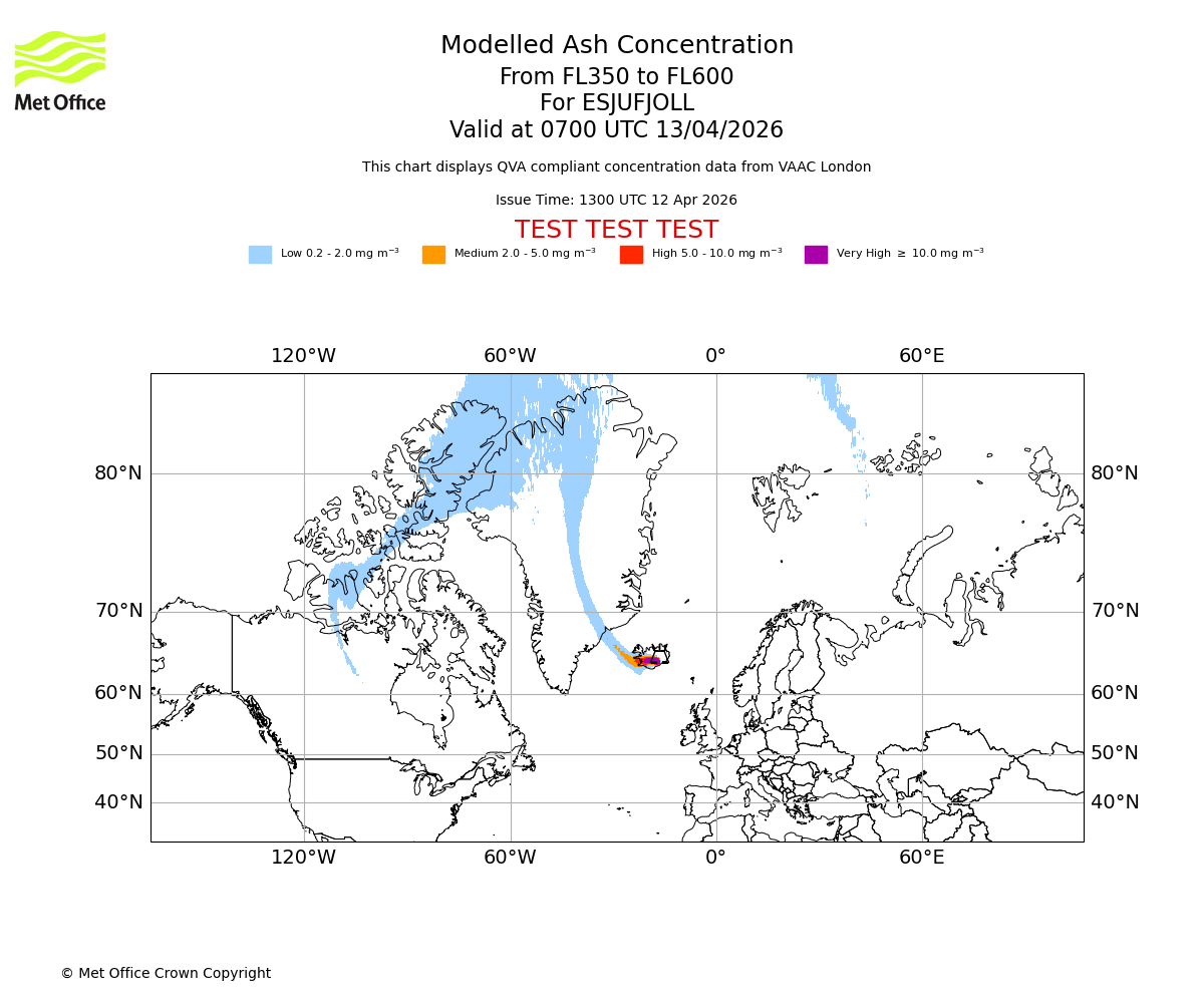 Modelled ash concentration from 350 to 600 for ESJUFJOLL. Valid at 0100 UTC 13/04/2026