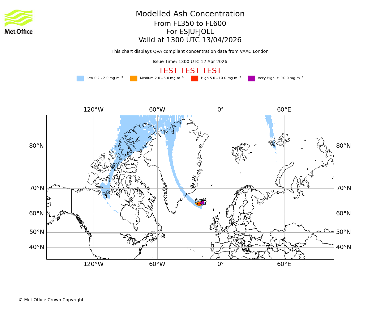 Modelled ash concentration from 350 to 600 for ESJUFJOLL. Valid at 0700 UTC 13/04/2026