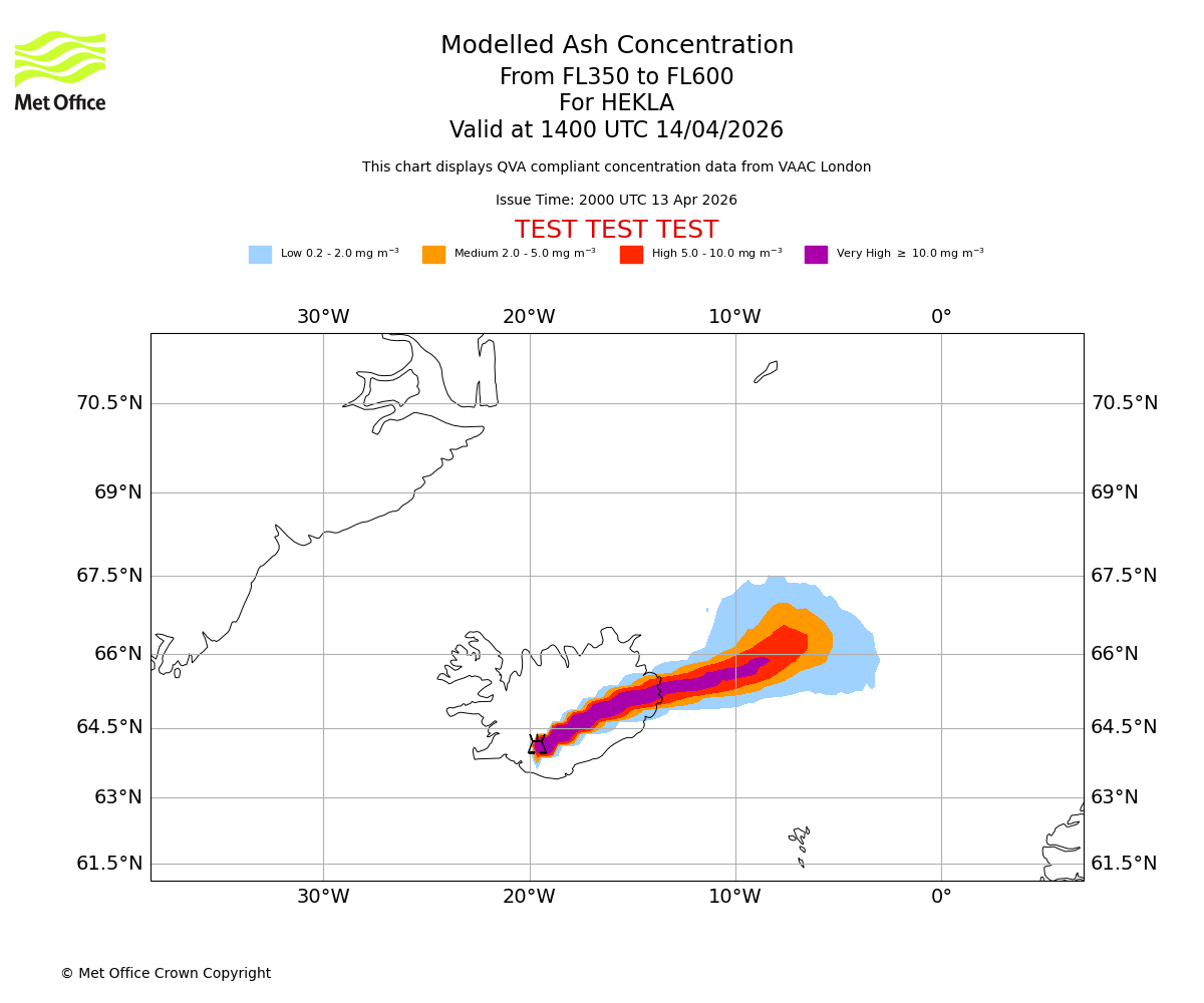 Modelled ash concentration from 350 to 600 for HEKLA. Valid at 0800 UTC 14/04/2026