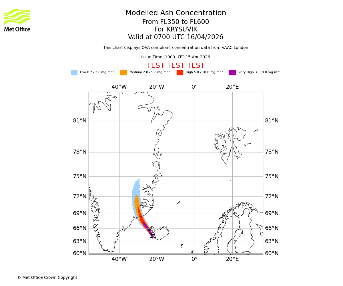 Modelled ash concentration from 350 to 600 for KRYSUVIK. Valid at 0100 UTC 16/04/2026