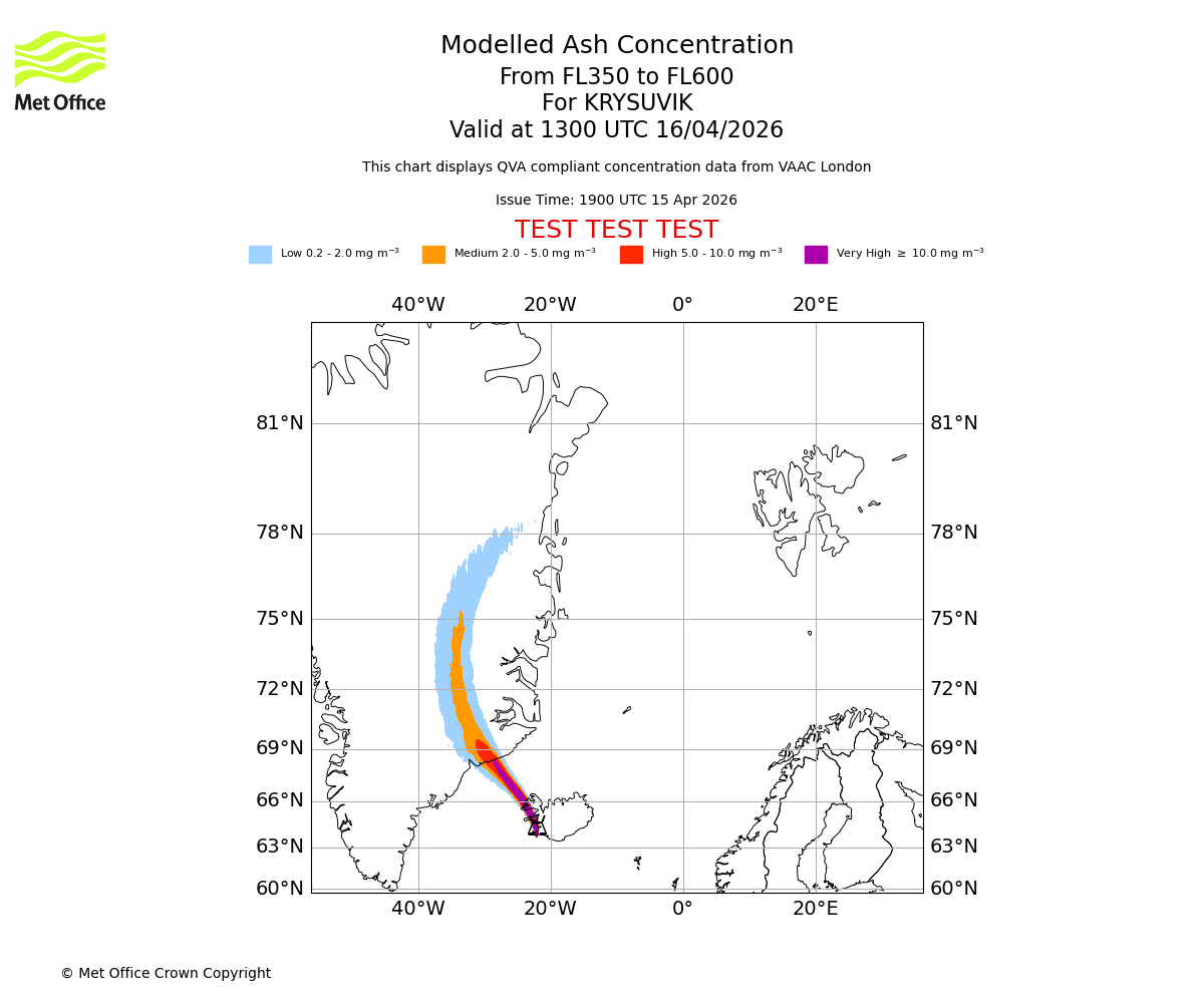 Modelled ash concentration from 350 to 600 for KRYSUVIK. Valid at 0700 UTC 16/04/2026