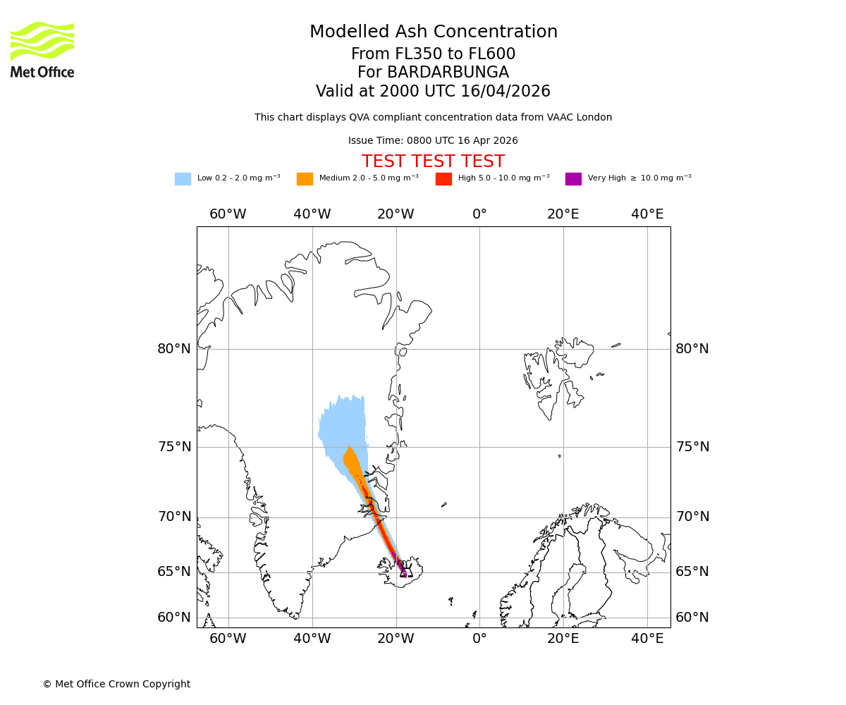 Modelled ash concentration from 350 to 600 for BARDARBUNGA. Valid at 1400 UTC 16/04/2026