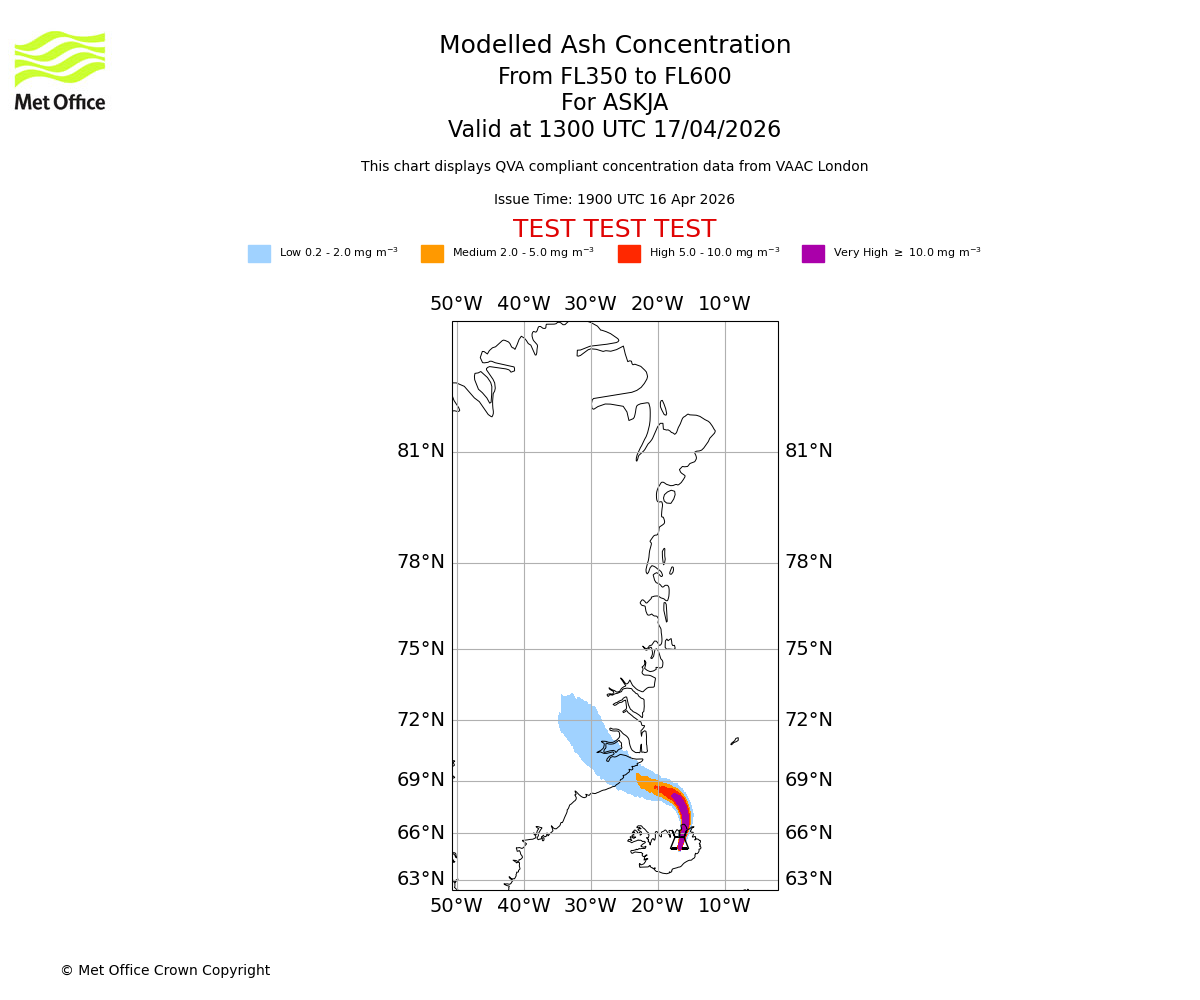 Modelled ash concentration from 000 to 050 for ASKJA. Valid at 1900 UTC 16/04/2026
