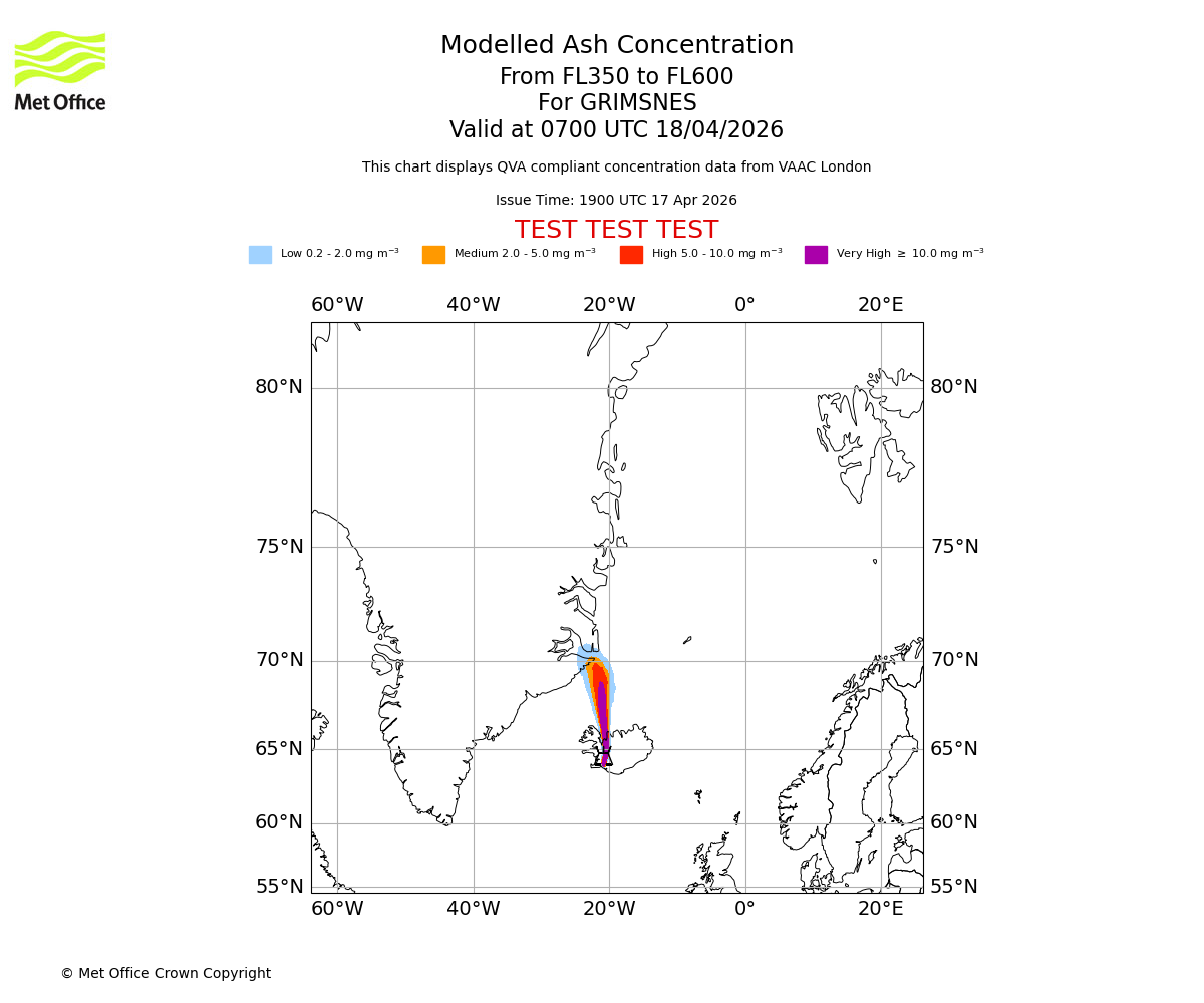 Modelled ash concentration from 350 to 600 for GRIMSNES. Valid at 0100 UTC 18/04/2026