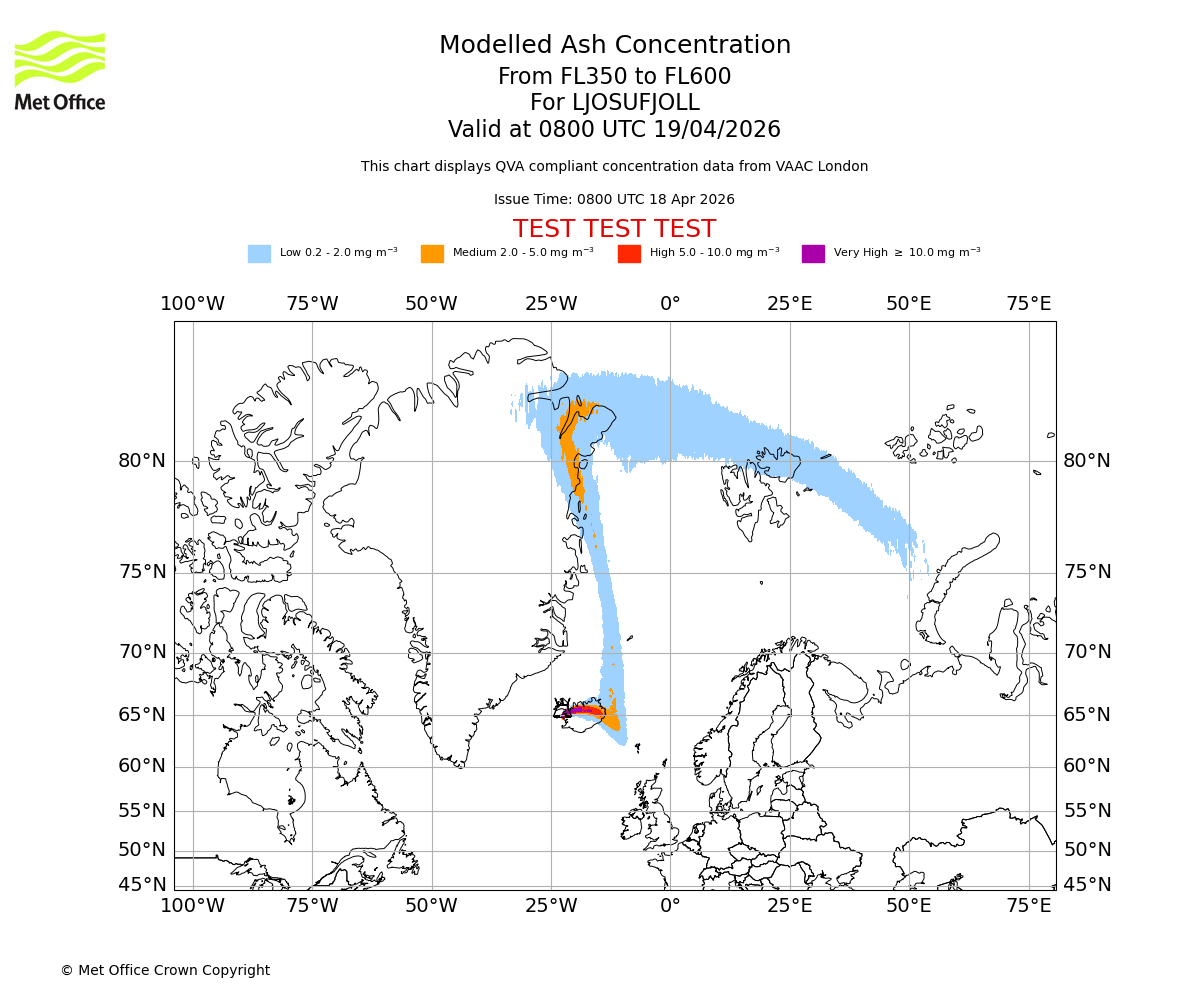 Modelled ash concentration from 350 to 600 for LJOSUFJOLL. Valid at 0200 UTC 19/04/2026