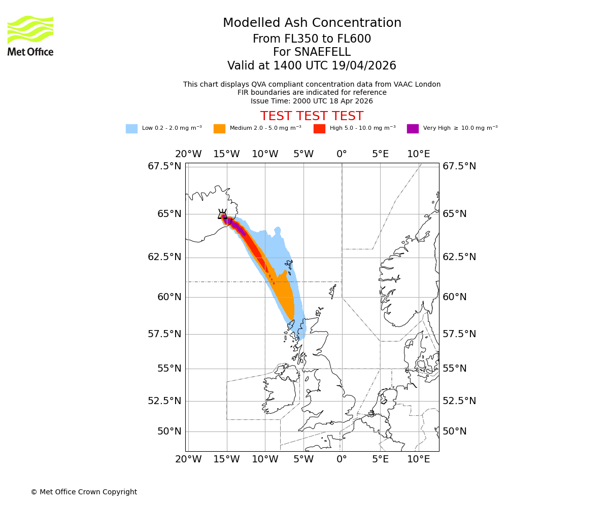 Modelled ash concentration from 350 to 600 for SNAEFELL. Valid at 0800 UTC 19/04/2026