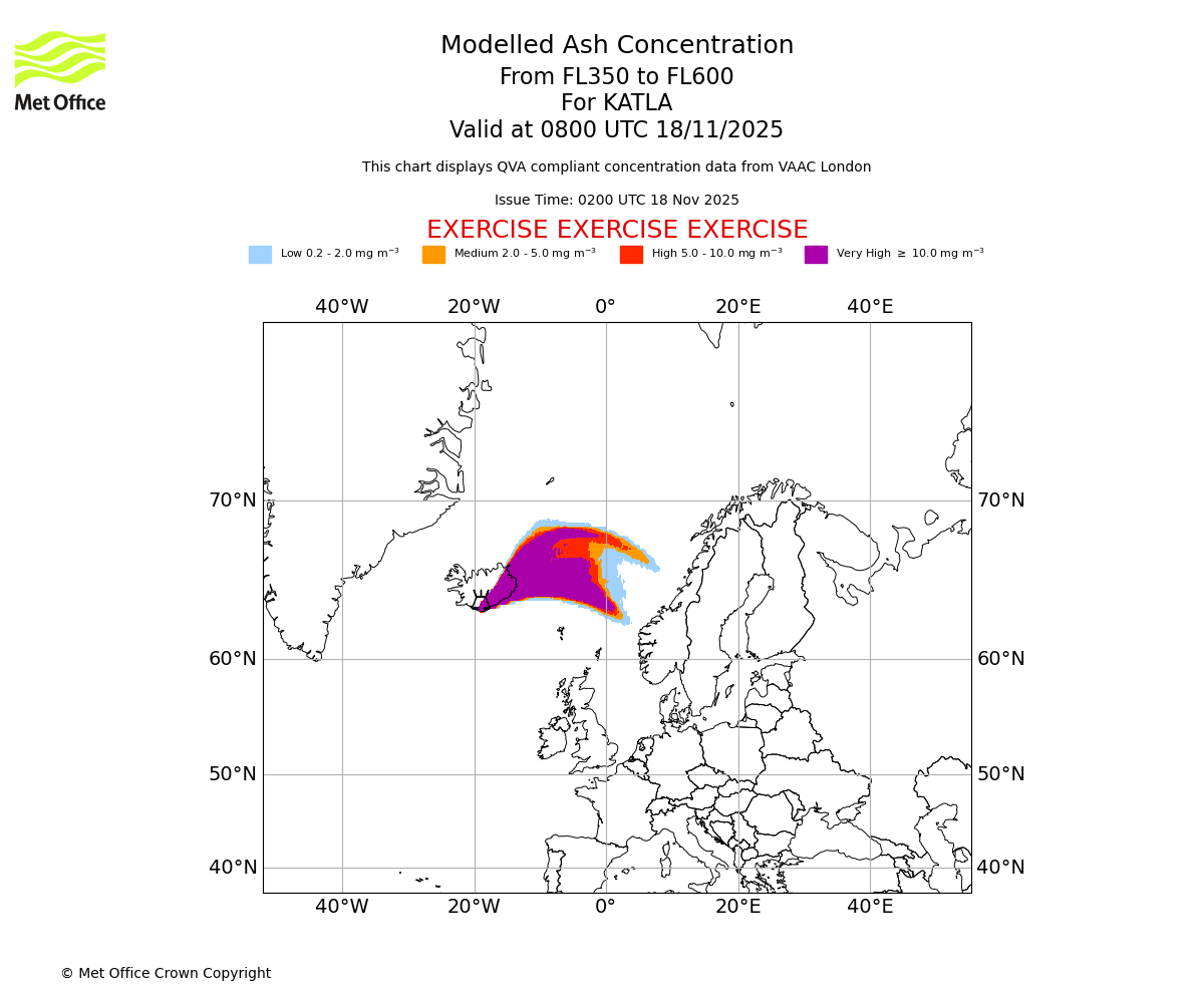 Modelled ash concentration from 350 to 600 for KATLA. Valid at 0200 UTC 18/11/2025