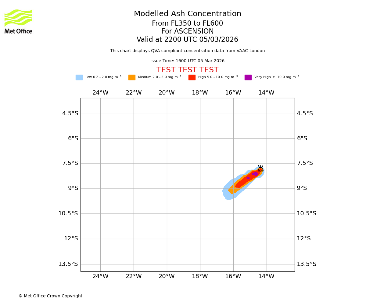 Modelled ash concentration from 350 to 600 for ASCENSION. Valid at 1600 UTC 05/03/2026