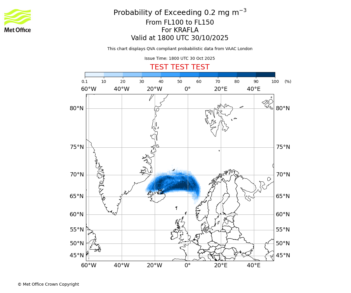Probability of exceeding 0.2 milligrams per metre cubed. From 050 to 100 for KRAFLA. Valid at 1800 UTC 30/10/2025