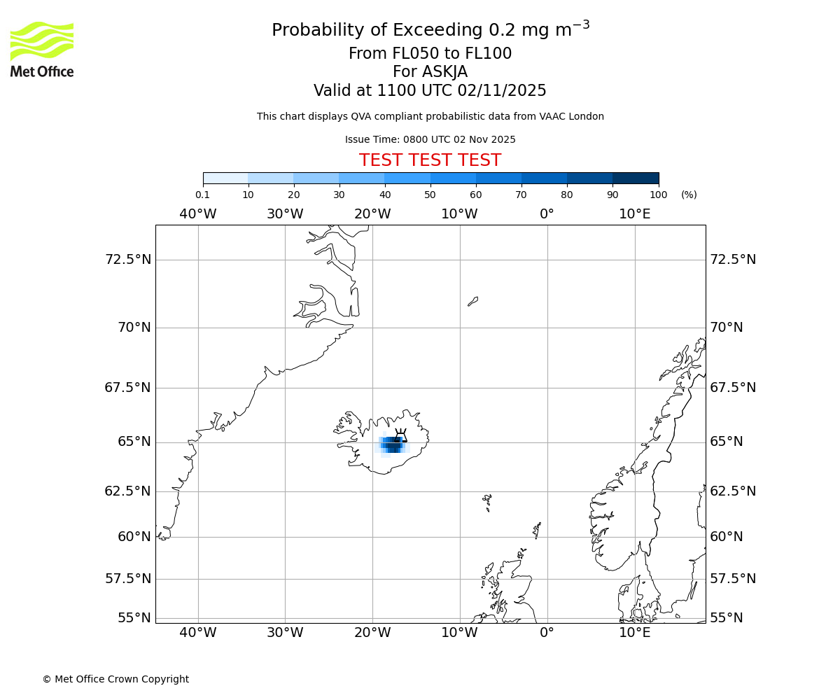 Probability of exceeding 0.2 milligrams per metre cubed. From 050 to 100 for ASKJA. Valid at 0800 UTC 02/11/2025