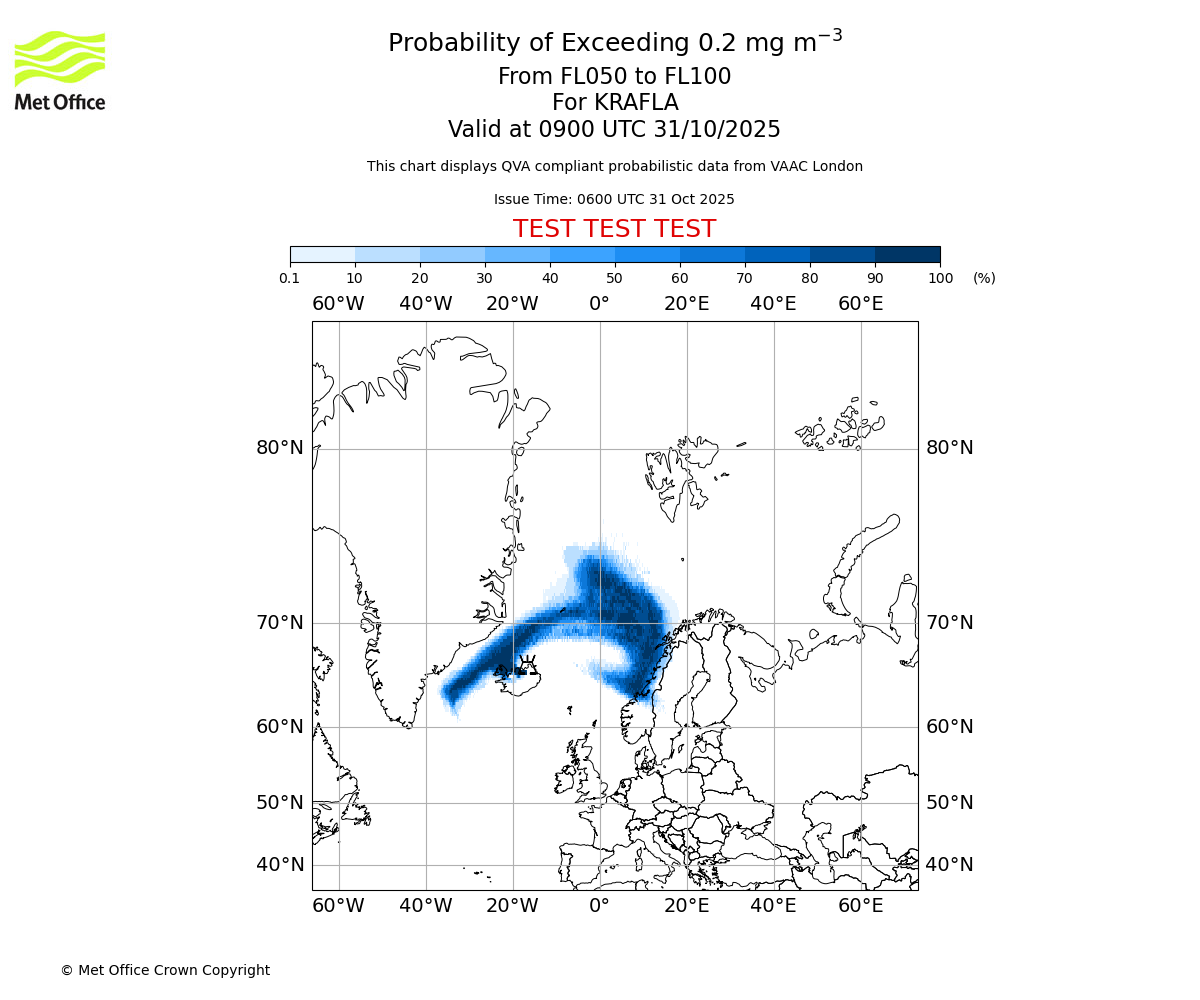 Probability of exceeding 0.2 milligrams per metre cubed. From 050 to 100 for KRAFLA. Valid at 0600 UTC 31/10/2025