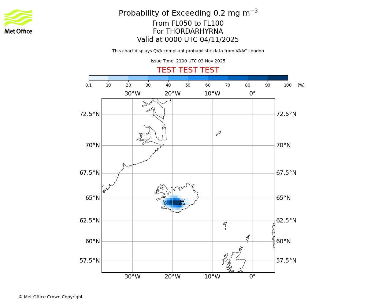 Probability of exceeding 0.2 milligrams per metre cubed. From 050 to 100 for THORDARHYRNA. Valid at 2100 UTC 03/11/2025