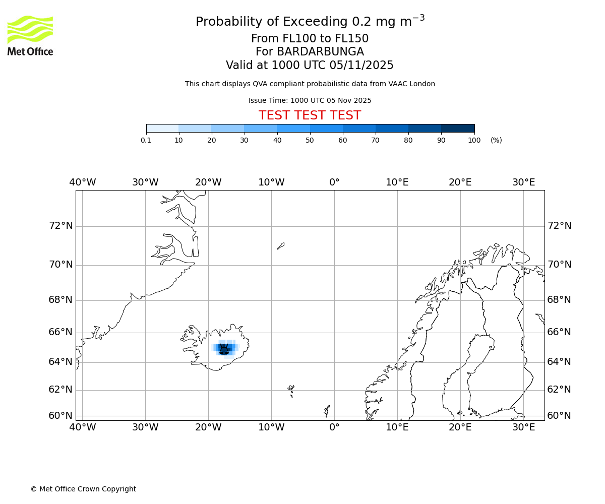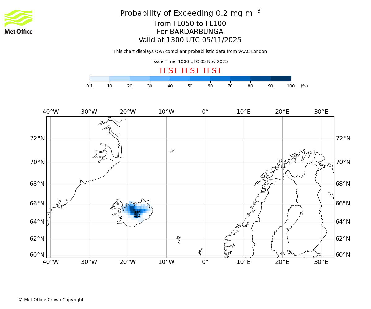 Probability of exceeding 0.2 milligrams per metre cubed. From 050 to 100 for BARDARBUNGA. Valid at 1000 UTC 05/11/2025