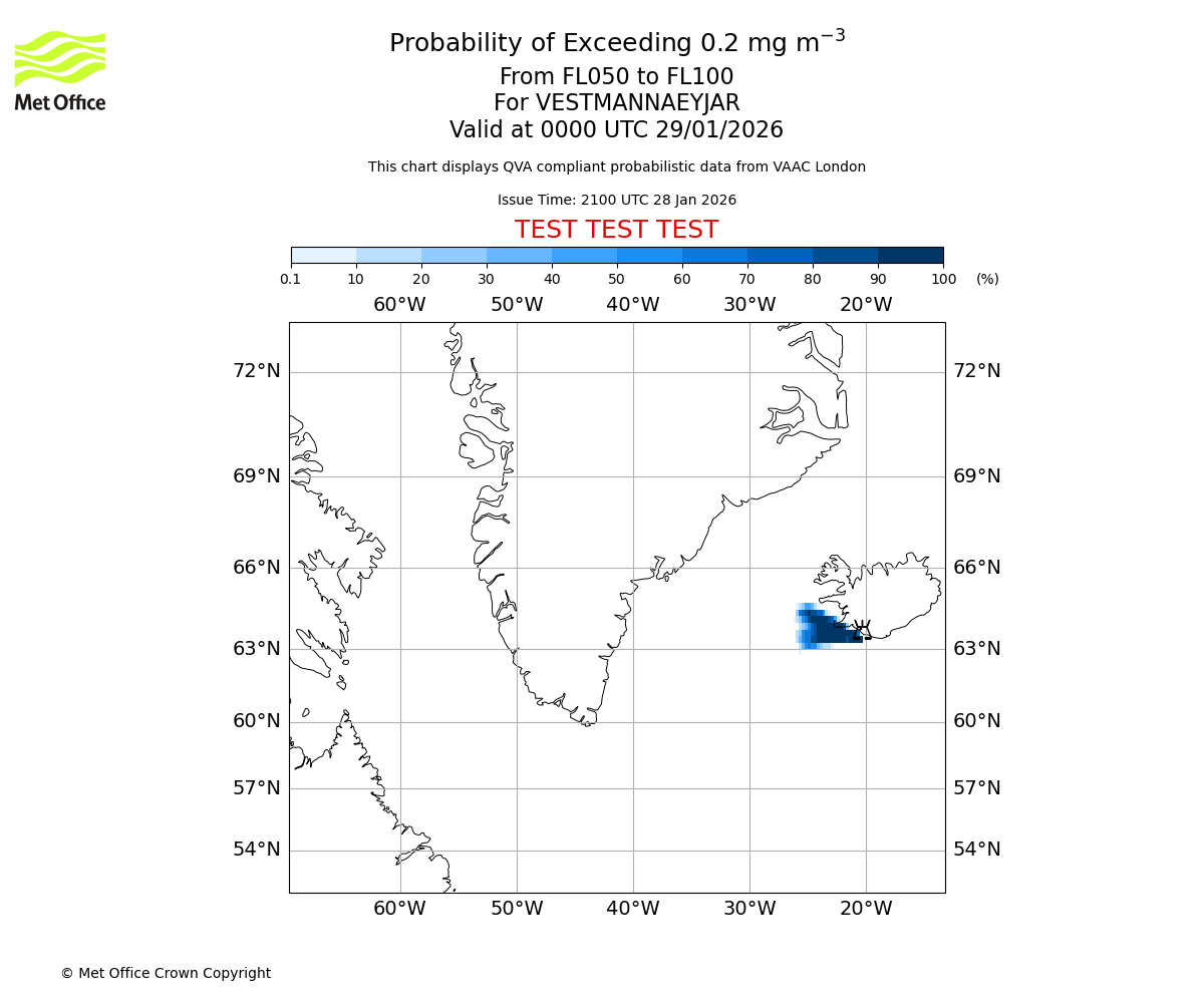 Probability of exceeding 0.2 milligrams per metre cubed. From 050 to 100 for VESTMANNAEYJAR. Valid at 2100 UTC 28/01/2026