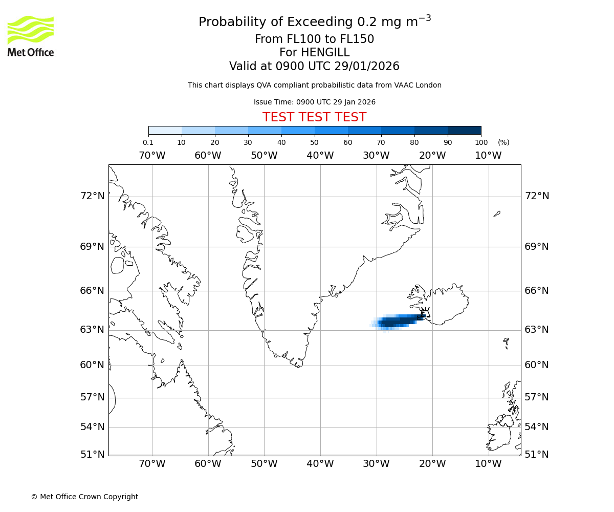 Modelled ash concentration from 000 to 200 for HENGILL. Valid at 0900 UTC 29/01/2026