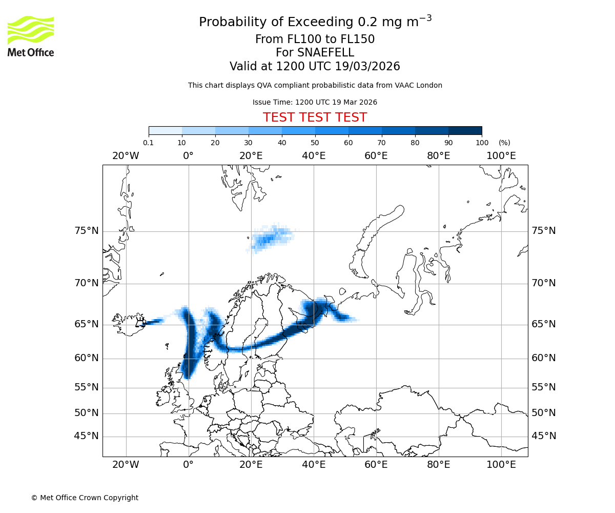 Quantitative Volcanic Ash charts (QVA) are produced in accordance with International Civil Aviation Organization (ICAO) Annex 3 requirements and are provided as well as the London Volcanic Ash Advisory Graphics (VAG) and Advisories (VAA). The lowest QVA threshold (0.2 mg/m³) matches to the areas depicted in the VAA and VAG. Both expected ash concentration and probabilistic forecast information is provided in the chart viewer below for eruptions occurring in the London Volcanic Ash Advisory Centre (VAAC) area of responsibility.