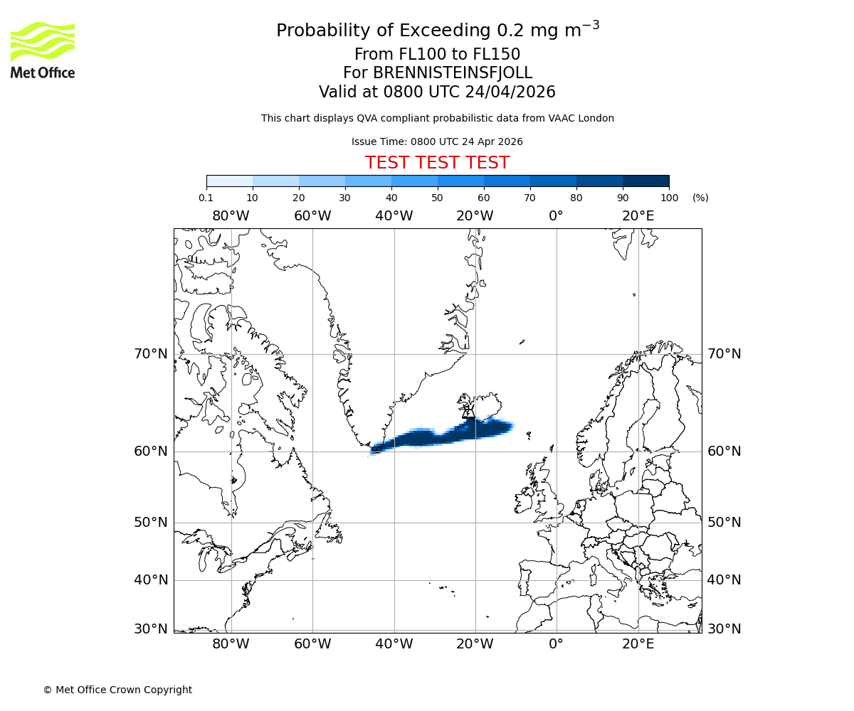Probability of exceeding 0.2 milligrams per metre cubed. From 050 to 100 for BRENNISTEINSFJOLL. Valid at 0800 UTC 24/04/2026