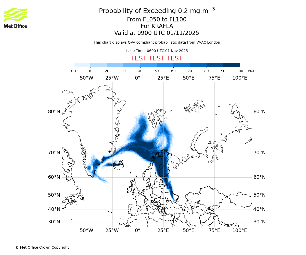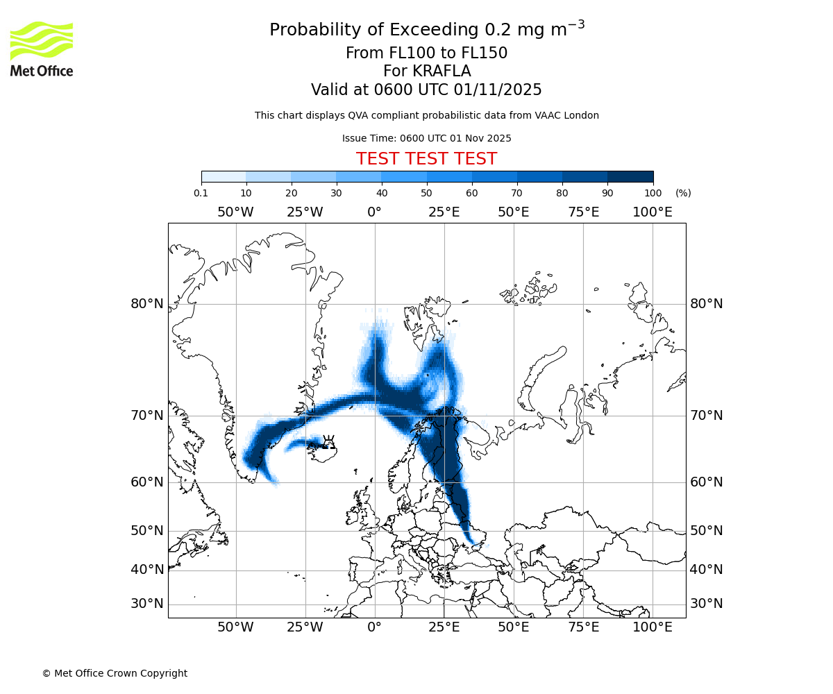 In accordance with ICAO Annex 3, Amendment 82 VAAC London will provide operational QVA forecasts from 27 November 2025 and these will be made available via a VAAC London QVA API information service. These charts are currently provided for test and evaluation purposes (not for operational use) until the introduction of the operational service.