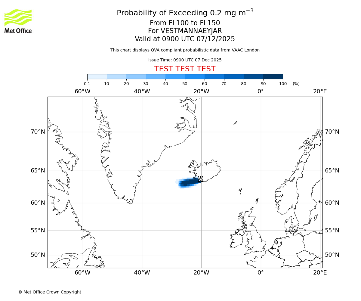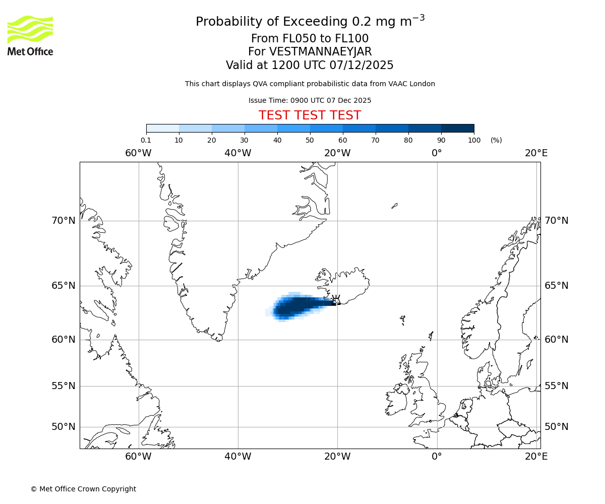 Probability of exceeding 0.2 milligrams per metre cubed. From 050 to 100 for VESTMANNAEYJAR. Valid at 0900 UTC 07/12/2025