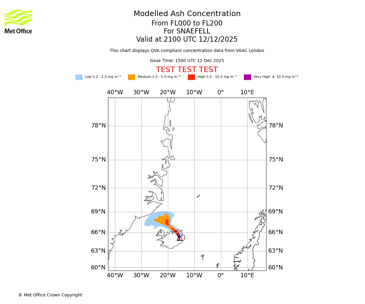 Modelled ash concentration from 000 to 200 for SNAEFELL. Valid at 1500 UTC 12/12/2025
