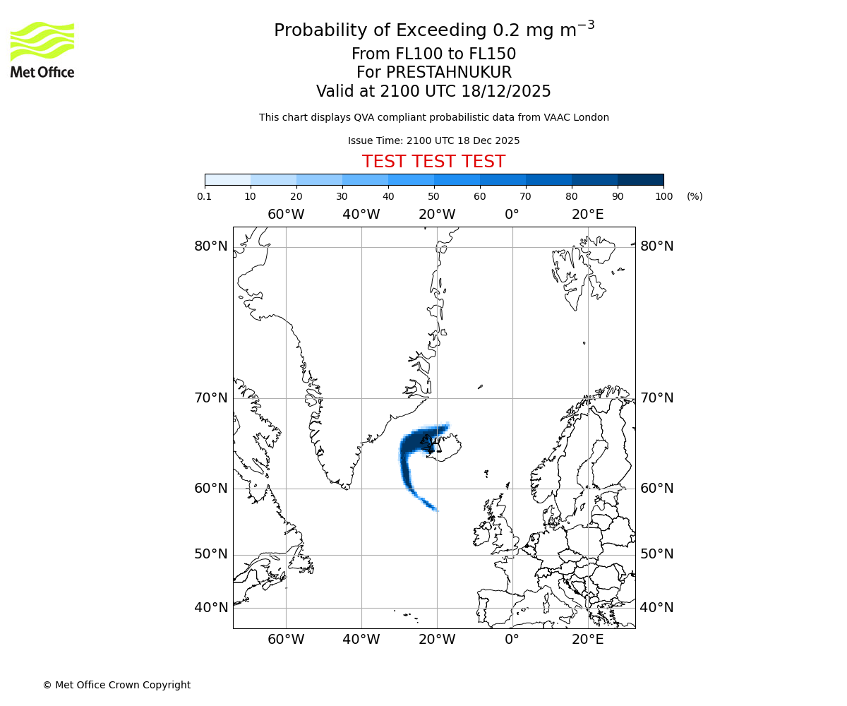 Quantitative Volcanic Ash charts (QVA) are produced in accordance with International Civil Aviation Organization (ICAO) Annex 3 requirements and are provided as well as the London Volcanic Ash Advisory Graphics (VAG) and Advisories (VAA). The lowest QVA threshold (0.2 mg/m³) matches to the areas depicted in the VAA and VAG. Both expected ash concentration and probabilistic forecast information is provided in the chart viewer below for eruptions occurring in the London Volcanic Ash Advisory Centre (VAAC) area of responsibility.