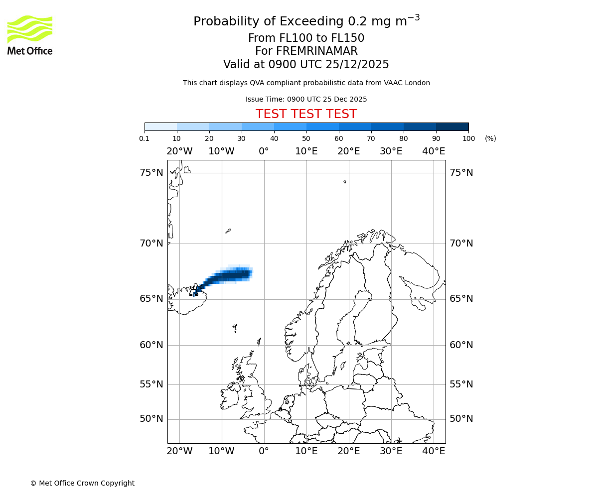 Modelled ash concentration from 000 to 200 for FREMRINAMAR. Valid at 0900 UTC 25/12/2025