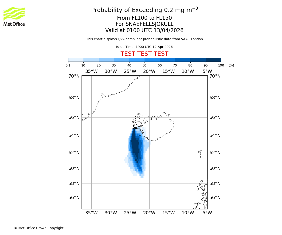 Probability of exceeding 0.2 milligrams per metre cubed. From 050 to 100 for SNAEFELLSJOKULL. Valid at 0100 UTC 13/04/2026