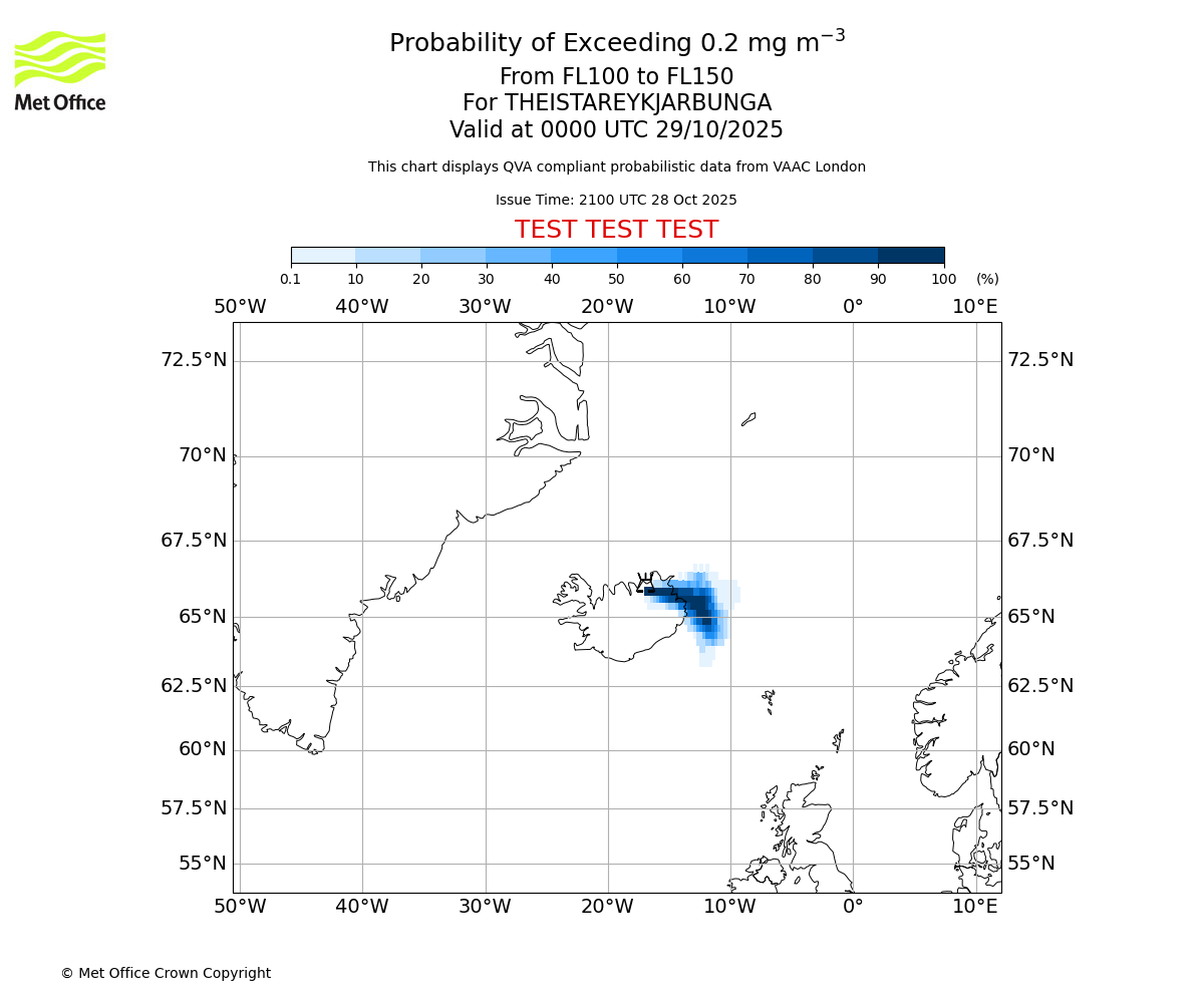 Probability of exceeding 0.2 milligrams per metre cubed. From 100 to 150 for THEISTAREYKJARBUNGA. Valid at 2100 UTC 28/10/2025